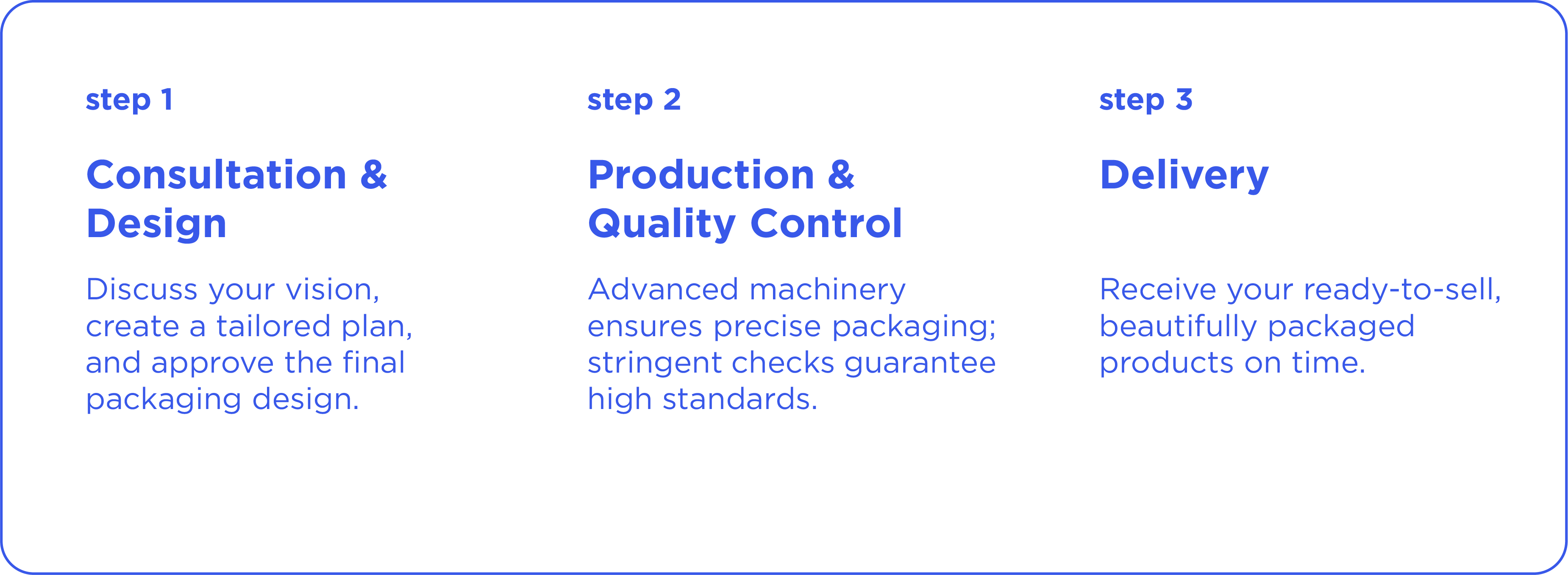 Develop unique packaging with your logos, colors, and design elements for a cohesive brand identity.